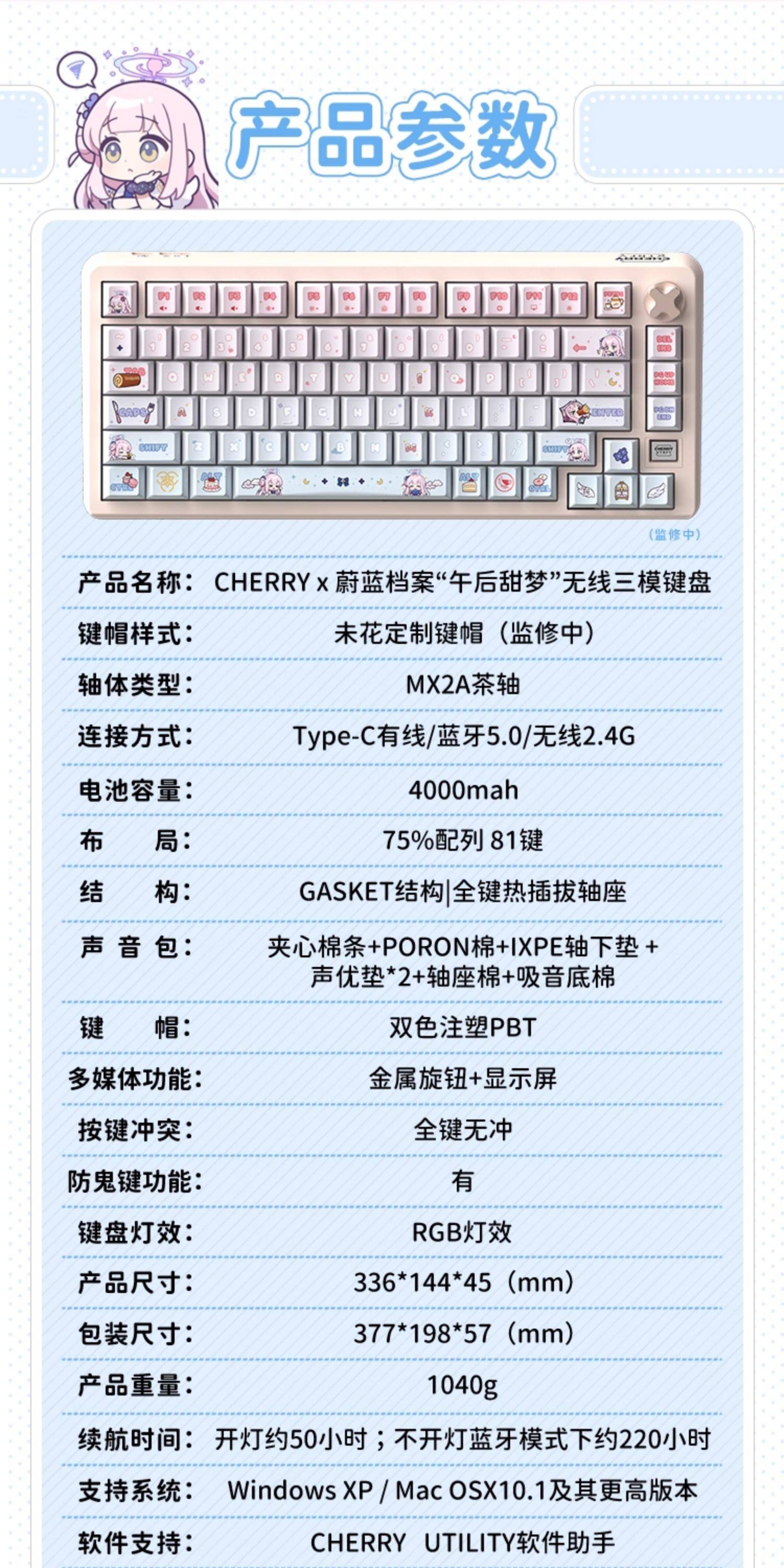 蔚蓝档案*CHERRY联名"午后甜梦"PIXIU75无线三模客制化机械键盘
